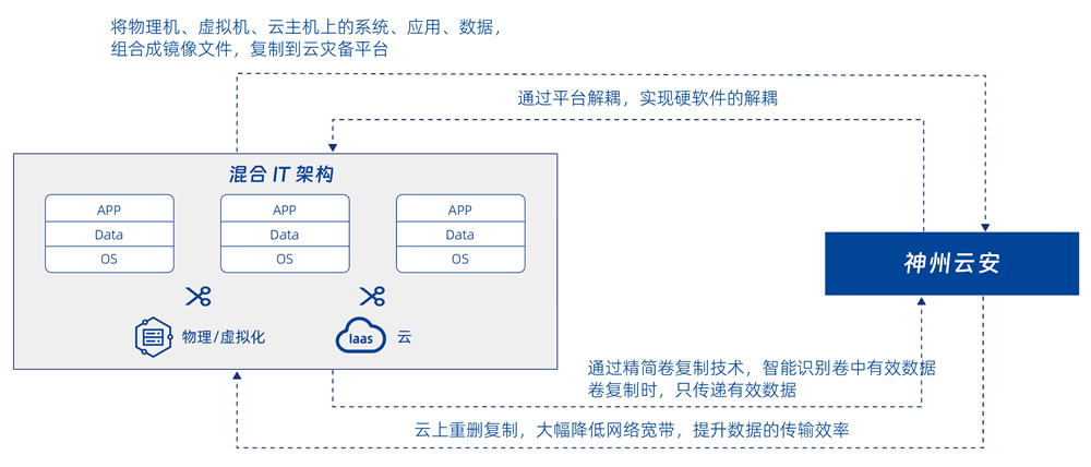 通过平台解耦和云镜像化复制,解决传统架构与云架构灾备一体化、业务跨异构平台迁移难的问题,并集备份、容灾功能为一体。